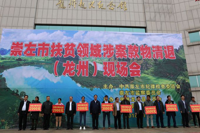 为使扶贫领域监督执纪问责工作的成果变成群众看得见、摸得着的实惠,提升群众的获得感,切实维护群众的根本利益,展示我县深化扶贫领域腐败和作风问题专项治理成果,让全县的党员干部现场受到警示和教育。11月20日,崇左市、龙州县在红八军纪念广场联合举办扶贫领域涉案款物清退现场会。